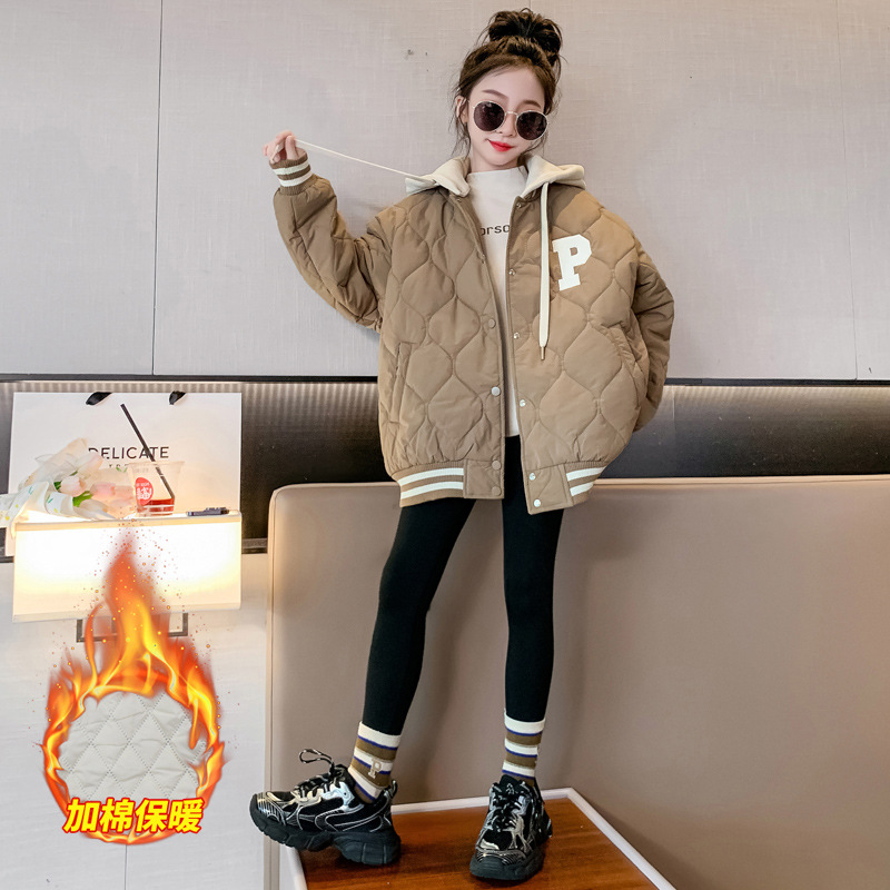 女の子の大きい子供の秋冬の綿の服の2024の新型の洋気の流行の厚い綿の服の女の子の冬の野球の服は帽子のコートと続きます。