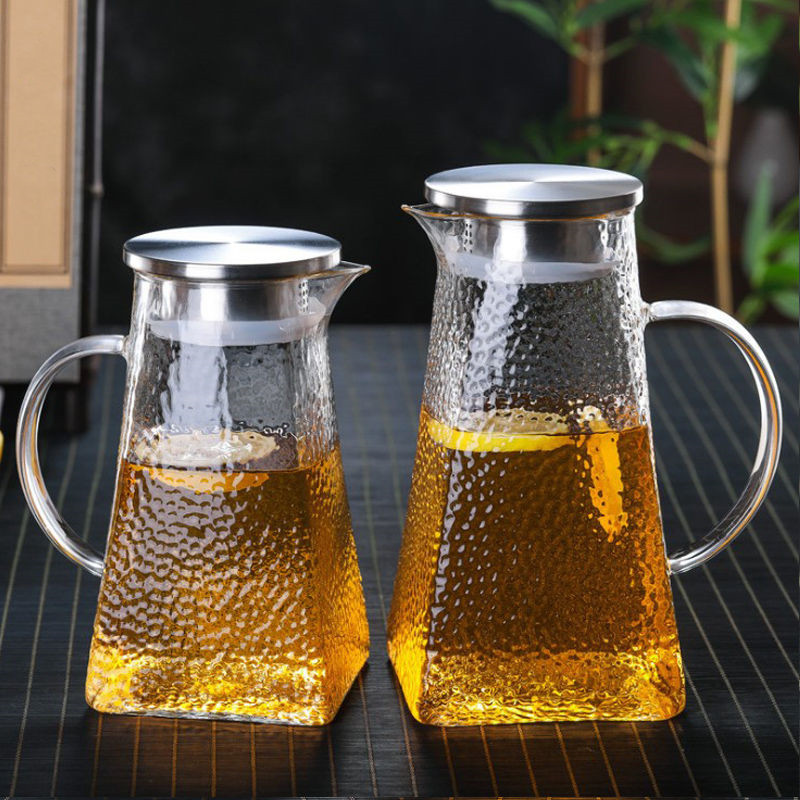 透明なガラスの冷たい白は水筒のハンマーの紋様の鋼の蓋のジュースの飲み物の壺の大容量のガラスの四角形の接客の水筒を開けます。