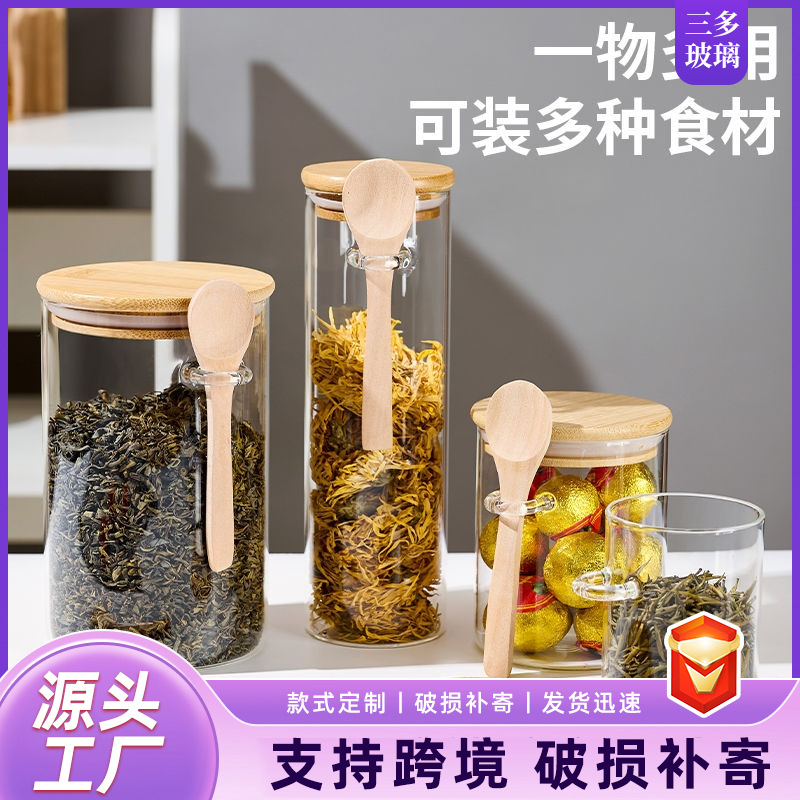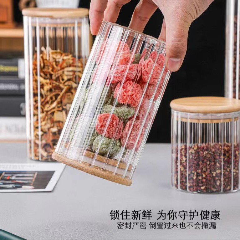 ガラス貯蔵タンク竹蓋円形直筒厨房収納タンククロスボーダー卸売りドライフルーツ雑穀収納瓶密封缶