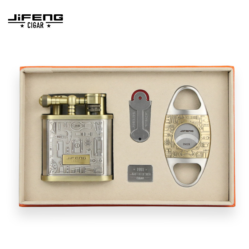 Jifeng季節風シガーライターセット金属シガードリル直充ライターと火石シガーナイフ