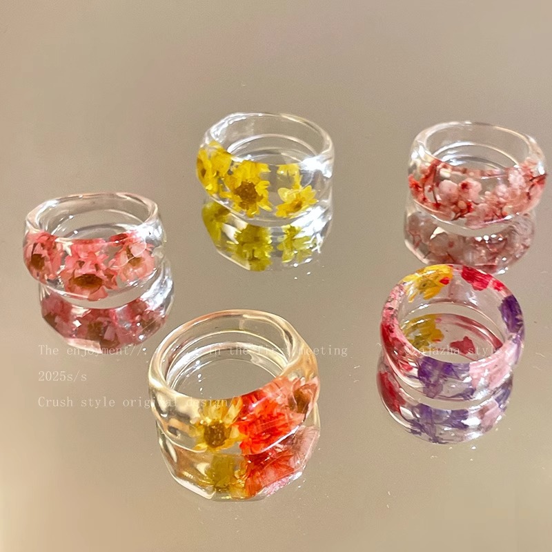 フレッシュデイジー透明ドライフラワーリング女性の夏の新しいニッチデザイン人差し指リング学生パーティーパーソナライズリング