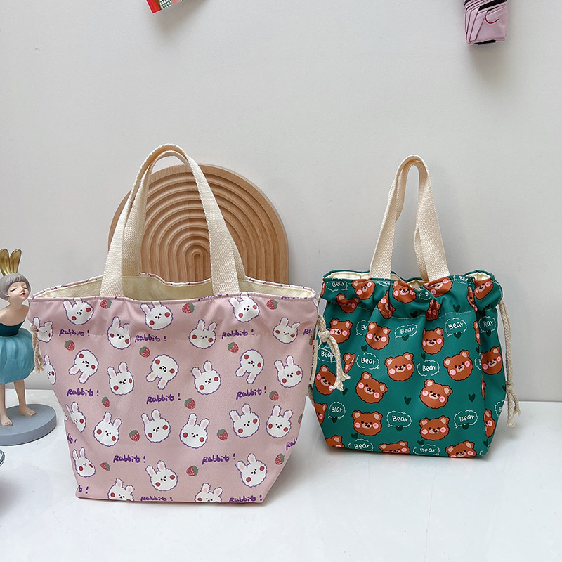 弁当袋の紐を引いて、手に入れて、簡単なピンクのウサギの緑の熊のプリントの布袋のサラリーマンはご飯の弁当箱の束口の包みを持っています。