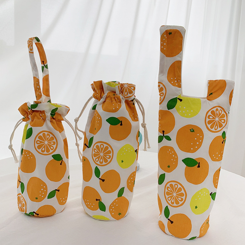 オレンジの手は水筒の袋のレモンの哺乳瓶の袋の傘の袋の杯を持っています。