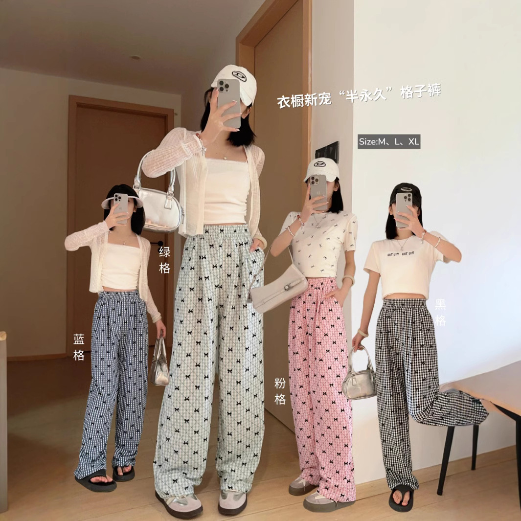 韓国系の蝶の格子縞のズボンの子供の垂れ下がった感の広い足のズボンの夏の薄いタイプのプリントの怠惰な風の高い腰のまっすぐな筒のカジュアルなズボン