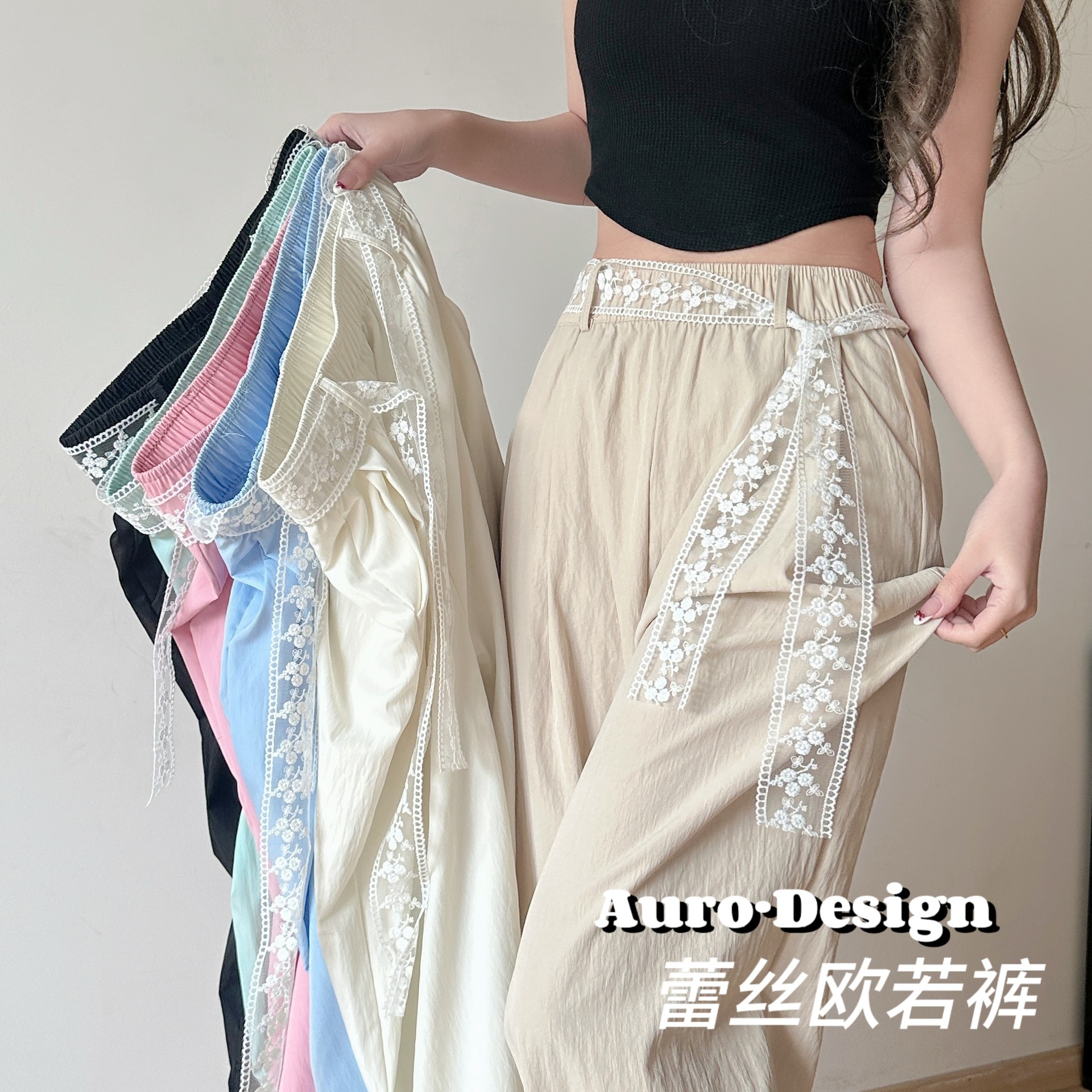 2025夏の高級感のあるワイドパンツ女性夏の韓国系の気質は、シンプルなレースベルトのストレートカジュアルパンツに合わせています。