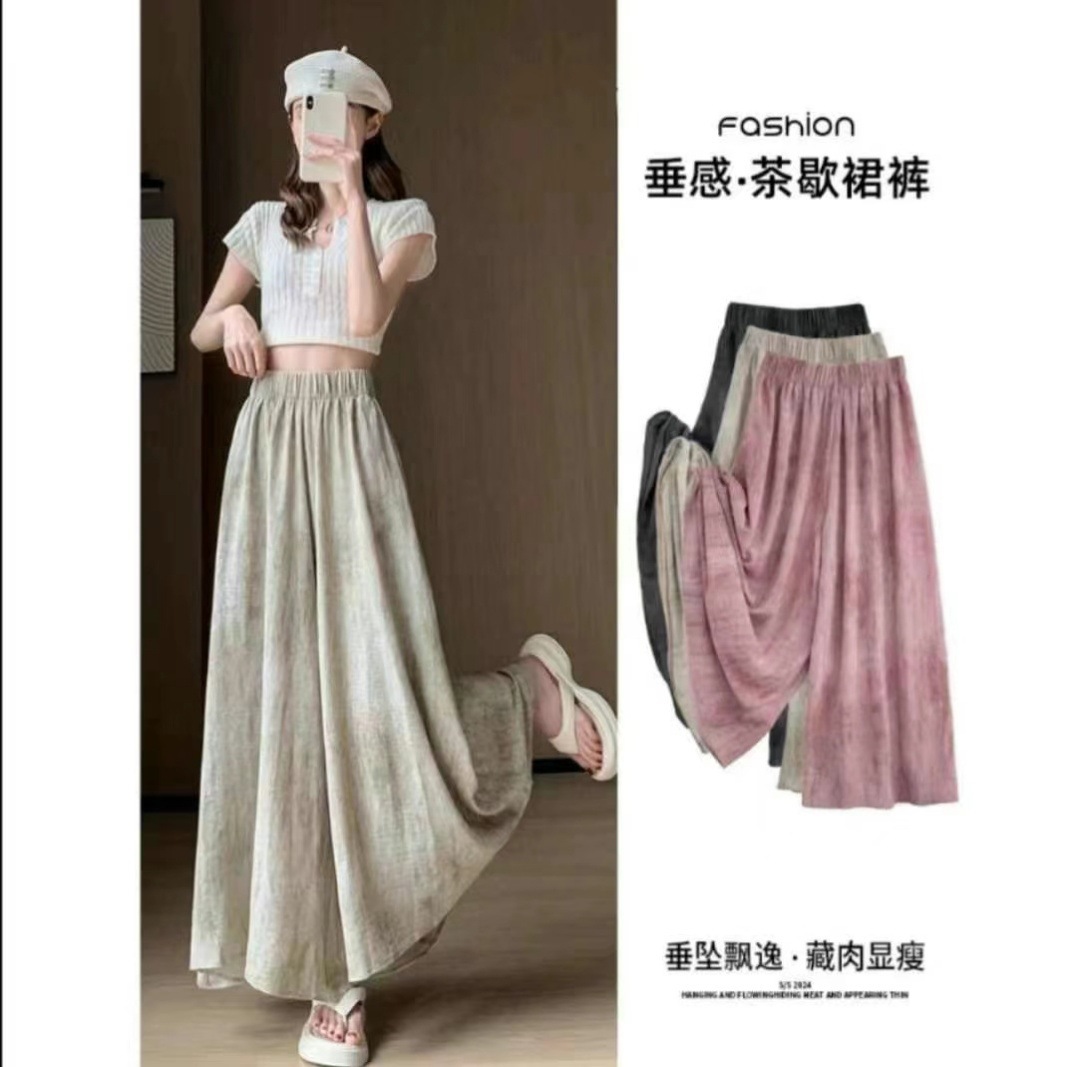 女性用プリントアイスシルクタイダイワイドレッグパンツ、夏のドレープ、多用途のルーズカジュアルパンツ、新しい中国風のスカートパンツ