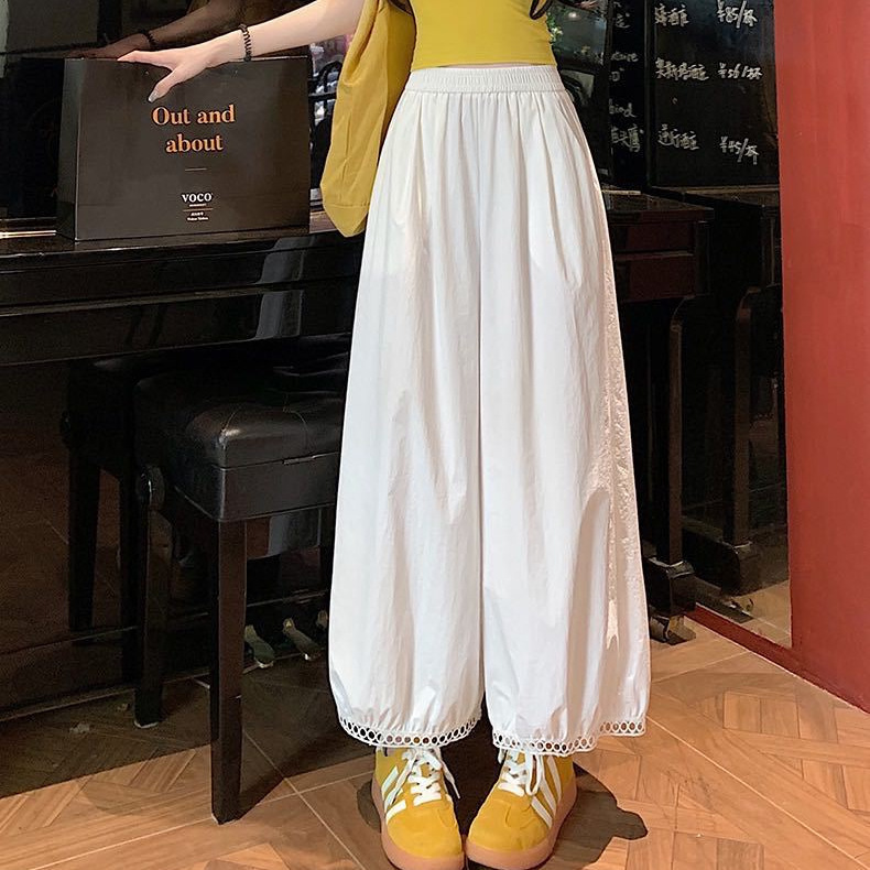 韓国系レースの縁の氷の糸の広脚のズボンの女性の夏の薄いタイプの高い腰の垂れ下がった感じのゆったりしているカジュアルな怠惰な風はズボンを引きずっています。