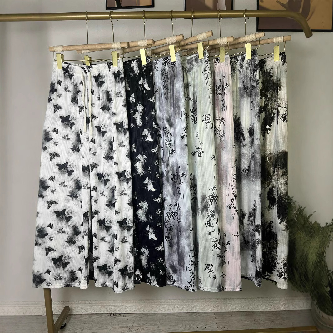 ハイエンドラミーパンツインク絞り染めスカートパンツ女性の夏薄い新しい中国風ルーズカジュアルワイドレッグパンツスカート
