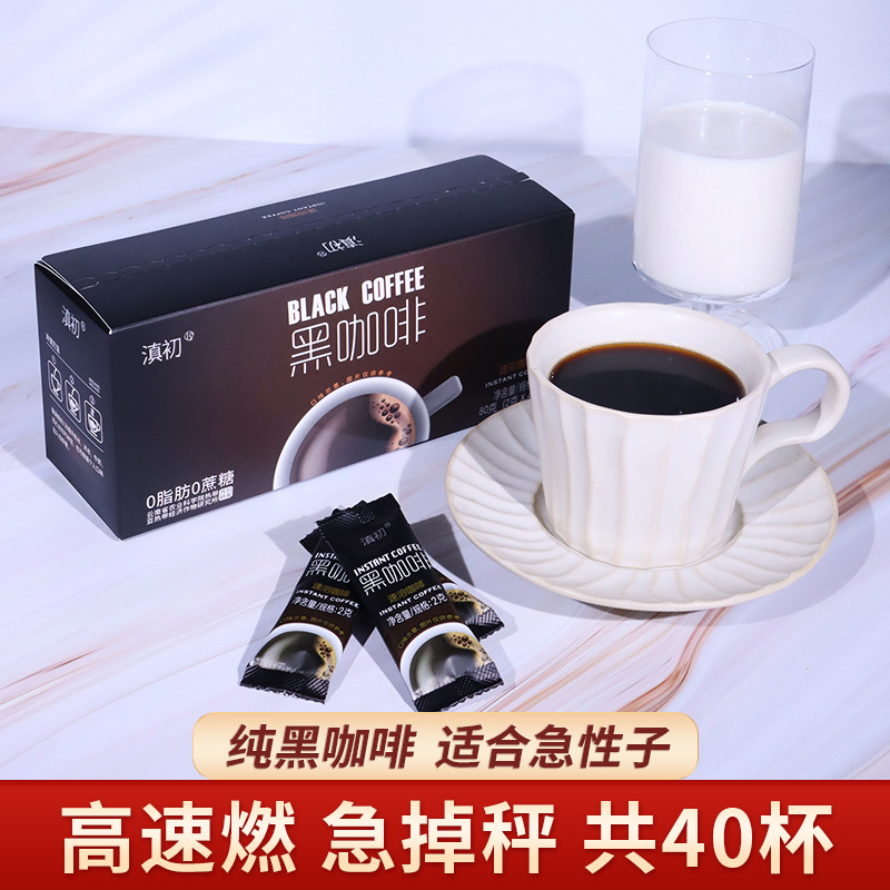 初のブラックコーヒー40本の箱にインスタントコーヒー粉の濃い香りの苦いコーヒーがあります。