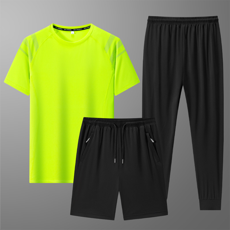 夏のスポーツスーツの大きいサイズの氷糸速乾運動レジャースーツの半袖tシャツの半ズボンの3セットの男