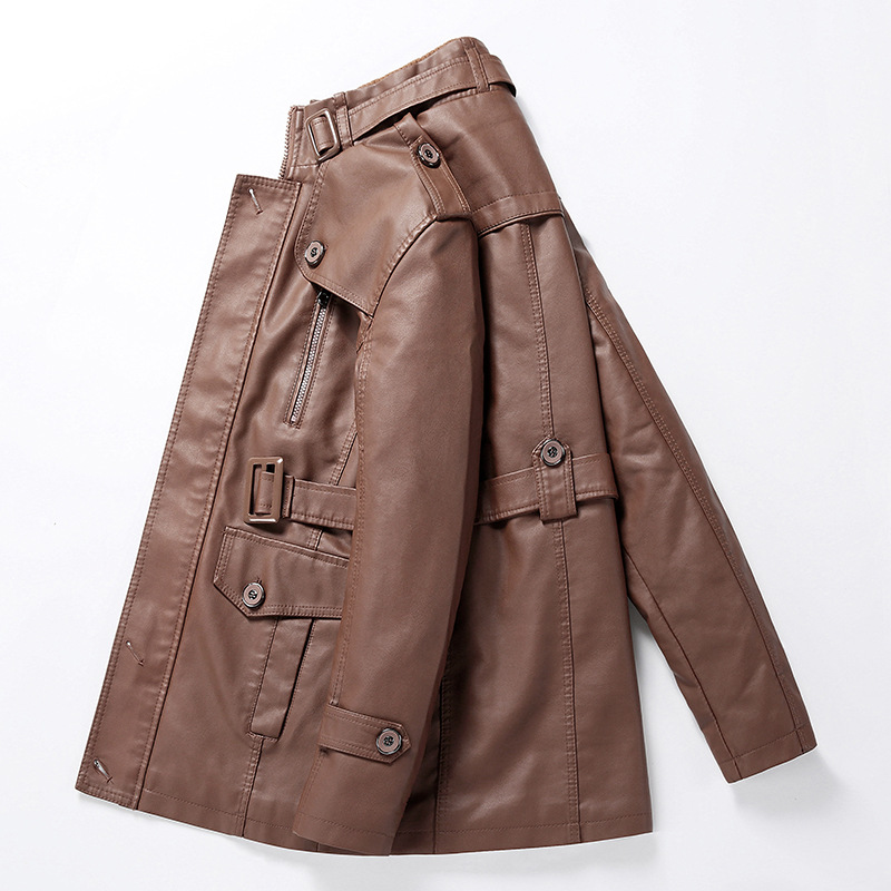 冬のスタンドカラーのカジュアルなファスナーの飾りのサイドスリットの挿し袋の黒い中の長いタイプの韓国のファッションの皮の服の男性の保温の外
