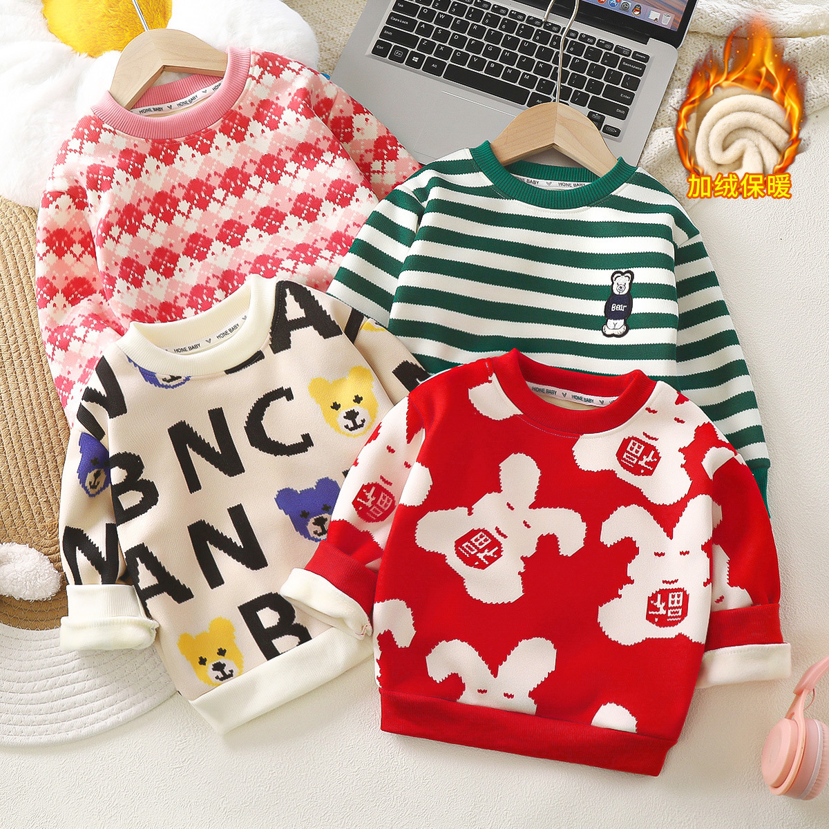 女の子と子供用の厚みのある韓国スタイルのボトリングシャツ、ベビー用の赤いベルベットのセーター、男性用の秋と冬の卸売セーター