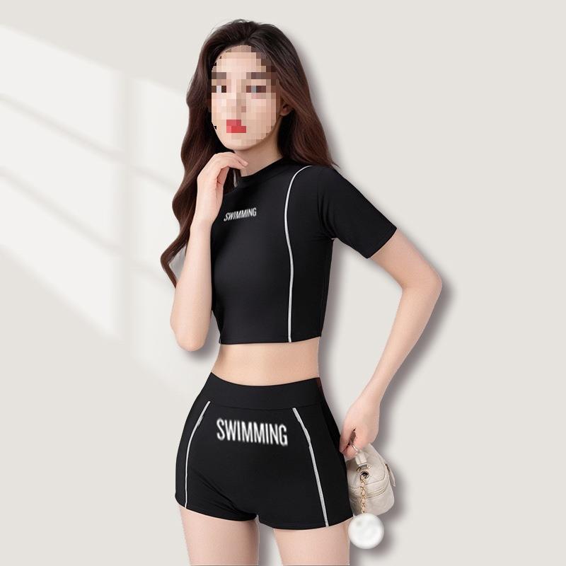 ツーピースソリッドカラー温泉 2024 バケーション水着卸売水着女性半袖スプリットブラック卸売水着痩身