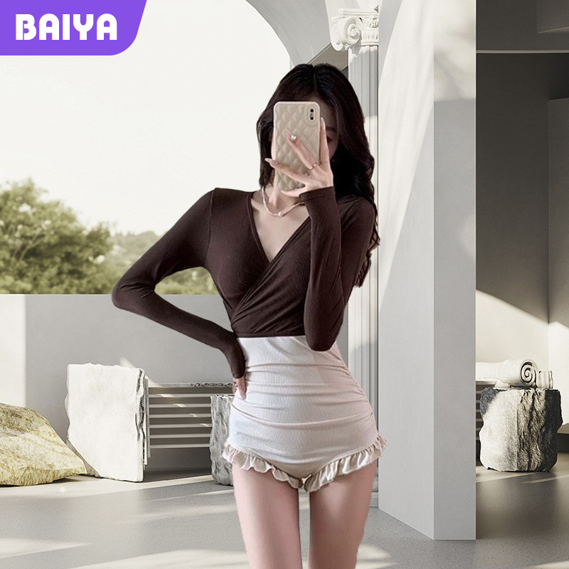 温泉水着、おしゃれでカジュアルな女性用水着、ツーピース、スリム、長袖、ワンピース、コンサバ、スリム、カラーブロック