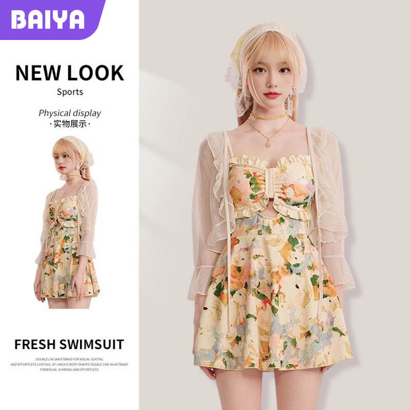 女性用水着夏長袖花柄ティーブレイクドレス休暇日焼け止めフレンチスリムで肉感のある気質の女性用スプリット水着