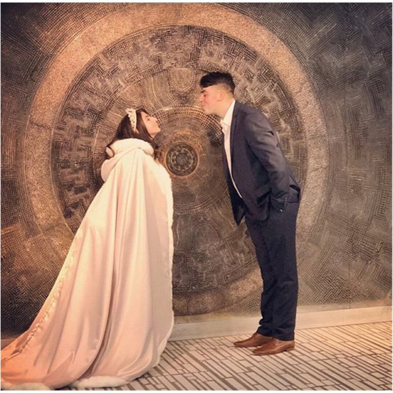 年結婚マントの縁に毛のついたサテンのコートはウェディングドレスの外に着ています。