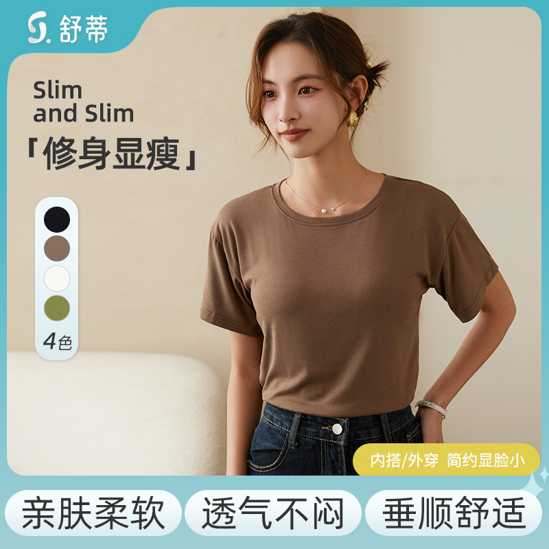 2024 新しい夏の無地半袖レディースラウンドネック気質スリムフィットシンプルで多用途な無地トップス Tシャツ