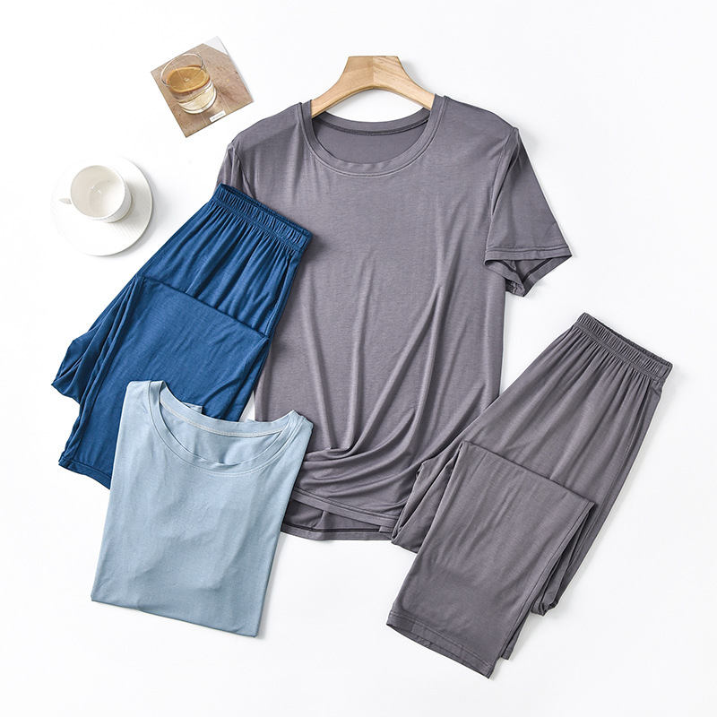 24新型夏モーダルラウンドネック男半袖長ズボンセット弾力ルームウェアカジュアル外着衝突色セット