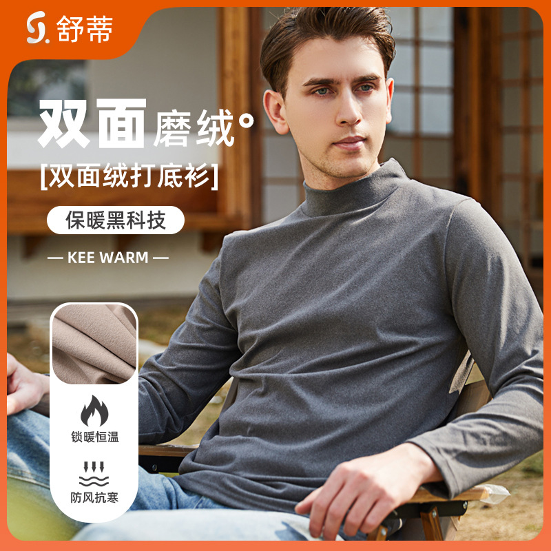 25メンズ両面フリースハイネックインナーシャツ春秋新作起毛中衿スウェット無地カジュアル長袖Tシャツ