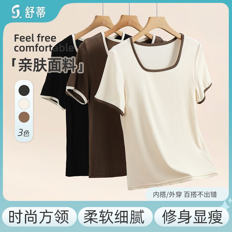 Shudi 2025 レディース スクエアカラー コントラストカラーステッチ スレッド半袖 Tシャツ カジュアルで多用途なニット スリムフィット ボトリング シャツ
