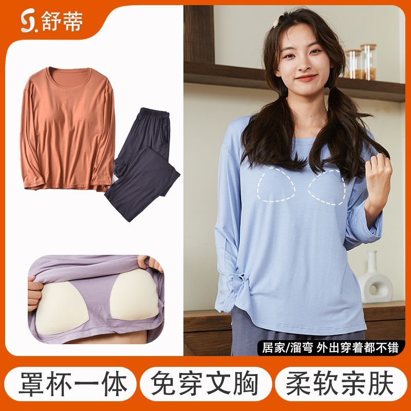 2024秋の新型胸パッド付き家庭服セット女性ブラジャー一体サイズ保温パジャマ長袖ズボン