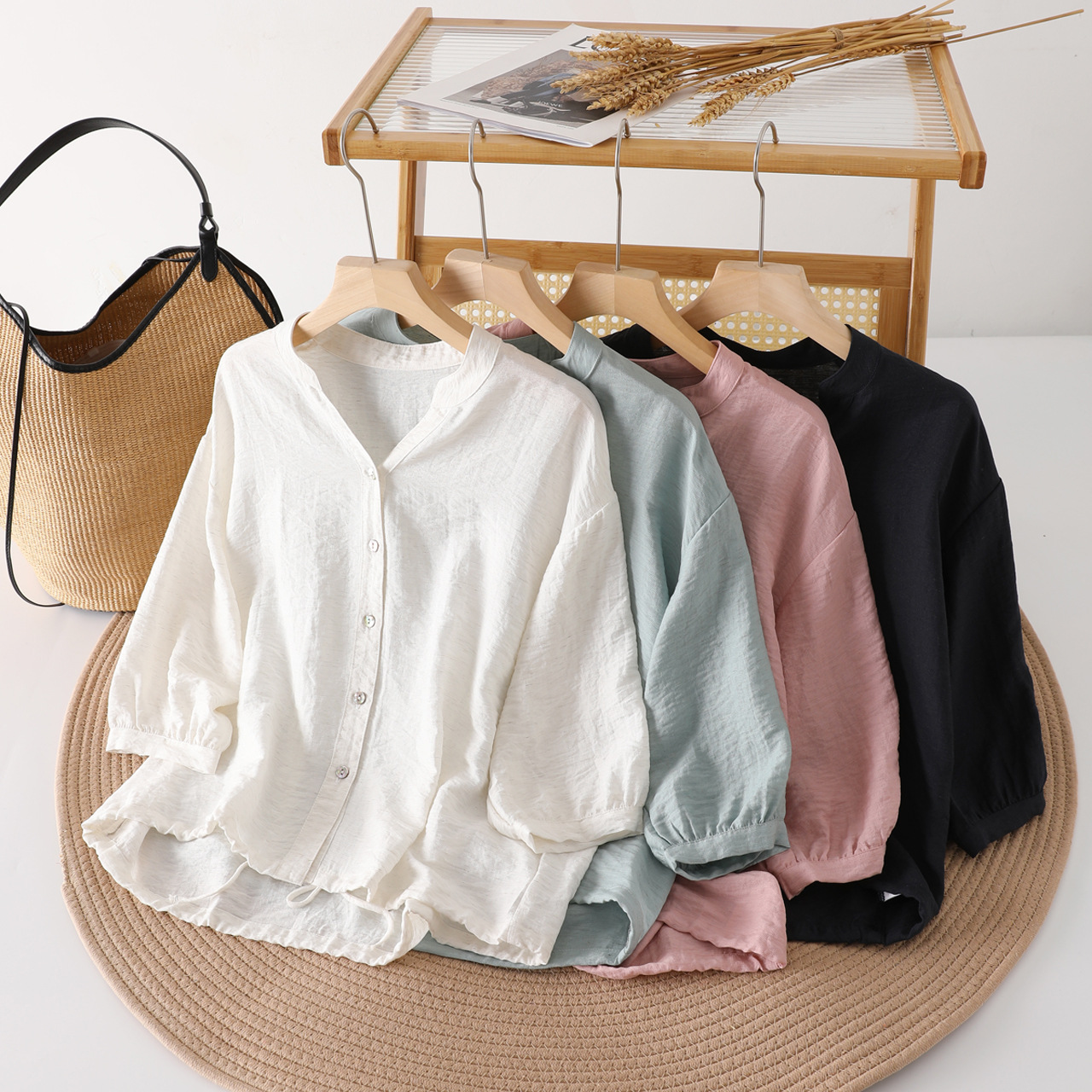 女性リネンウォッシュ七分袖ブラウスレディースシャツシャツ女性服夏のトップ