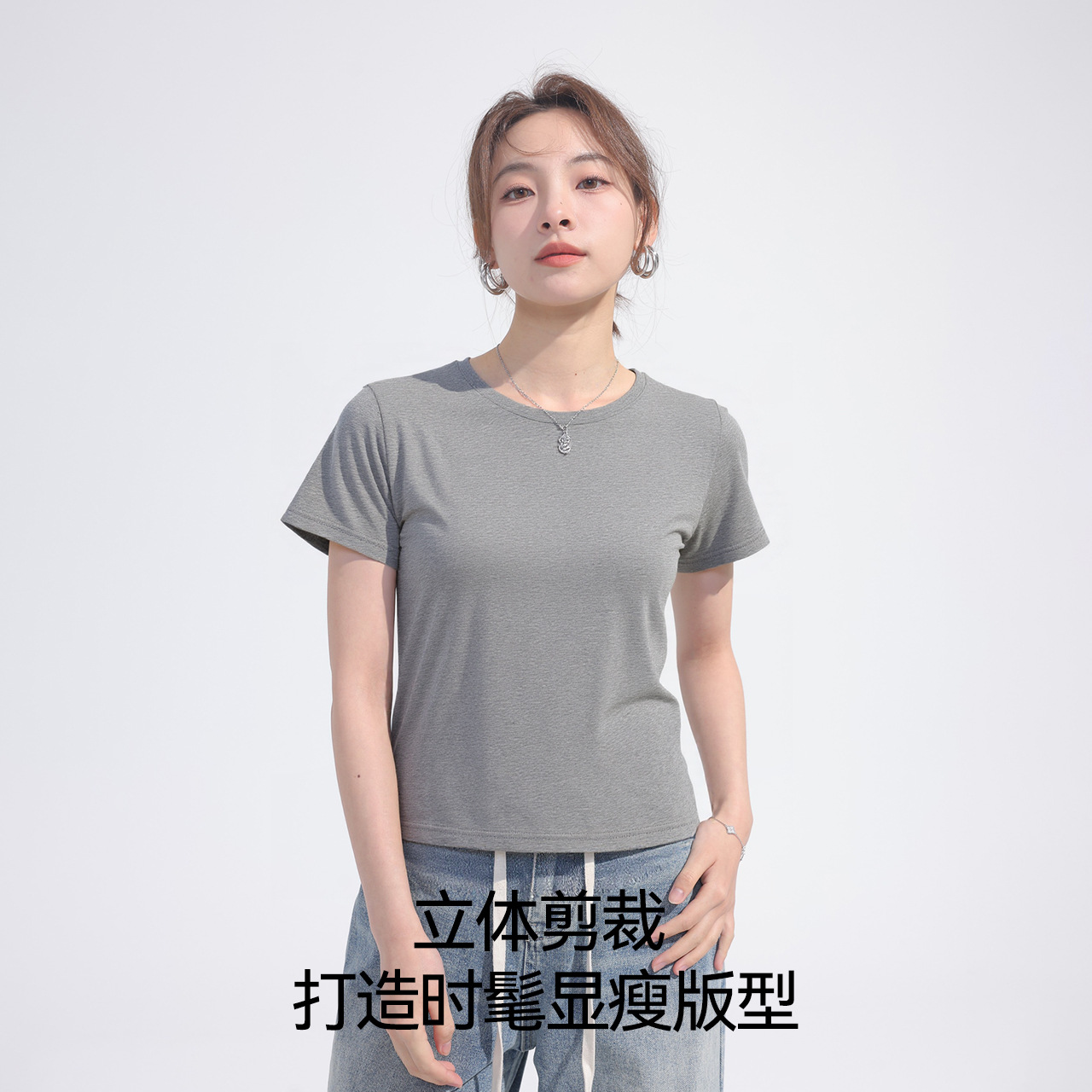 夏の新型百合修身半袖上着丸首純色tシャツ弾性底シャツ女