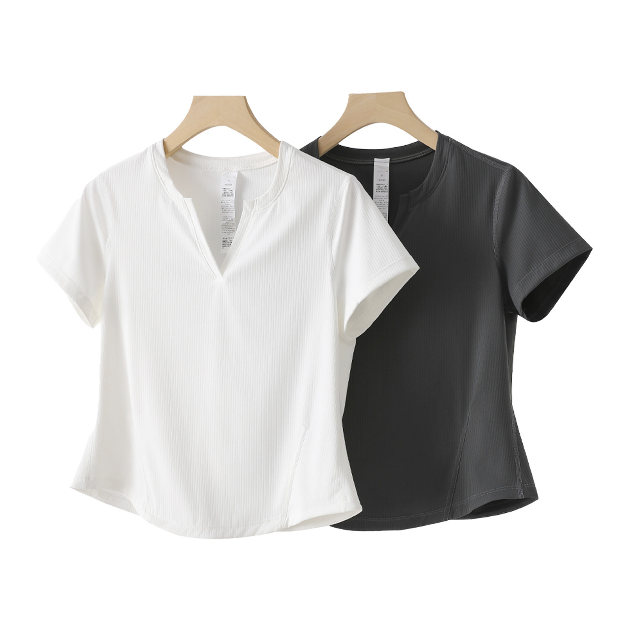 レディースリブ襟オープン半袖Tシャツスポーツスリムトップ