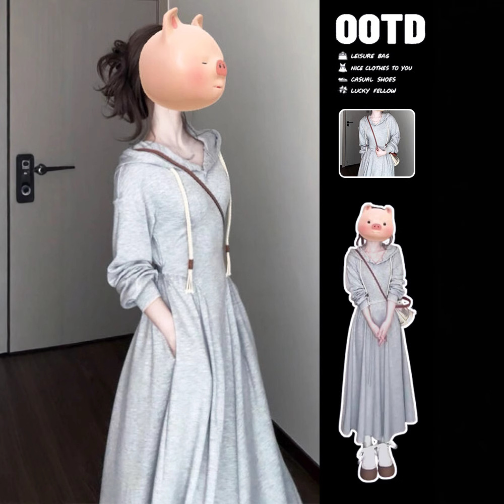 小柄な女性向けグレーのフード付き長袖ワンピース、2025年秋冬新作、韓国風コーディネート、スウェット素材のミディ丈ワンピース