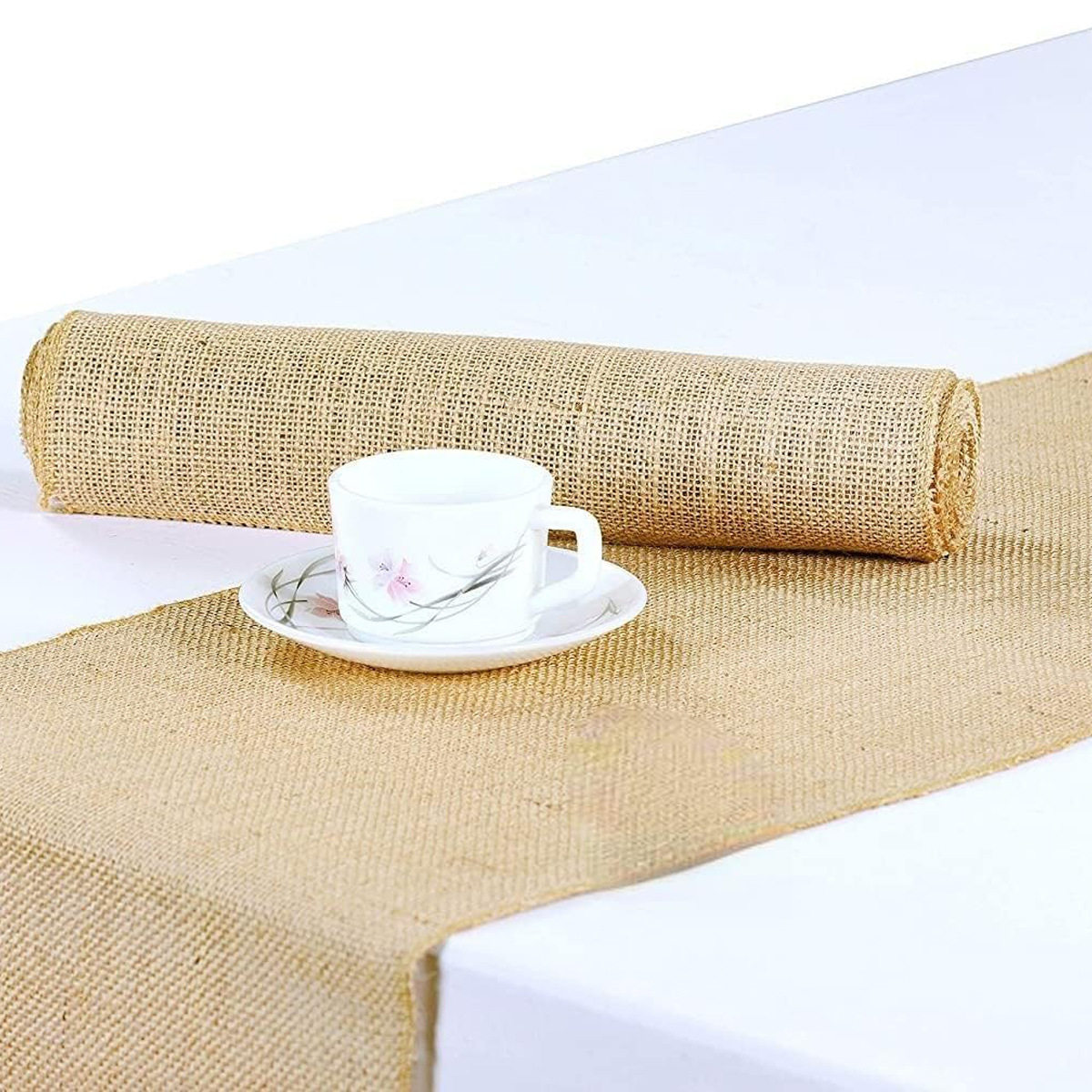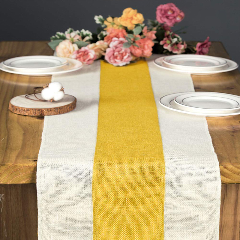 アマゾン原色の粗い麻布のテーブル旗のレトロな田舎の田園の結婚式のパーティーのテーブルの装飾は黄麻のテーブルの旗を編みます。