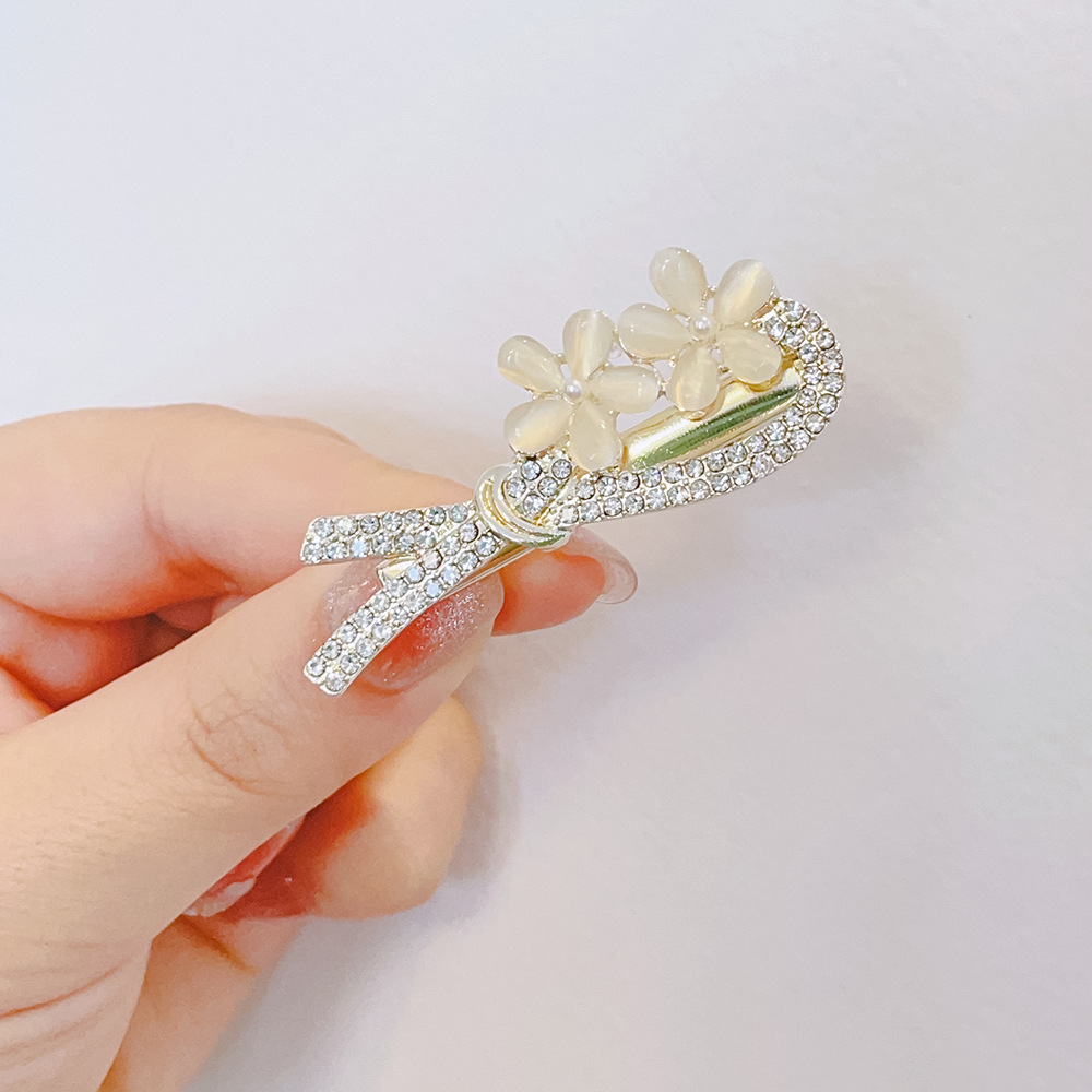 新商品の合金はダイヤモンドの蝶結びを入れて、猫の目の石の花の女性の高級感のアヒルの口を挟んでサイドクリップの卸売りを挟みます。