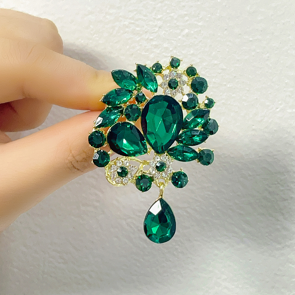 欧米の越境ファッションの緑色の水滴のブローチの優雅な大きいガラスはダイヤモンドの高級感の胸の花のウェディングドレスのピンを入れます。