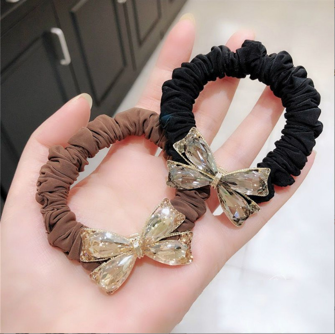 韓国版の精巧な新型の水晶の蝶結びの髪の縄は馬尾の髪の輪の小腸の輪の皮の筋の団子の頭を刺して簡単に縄を結びます。