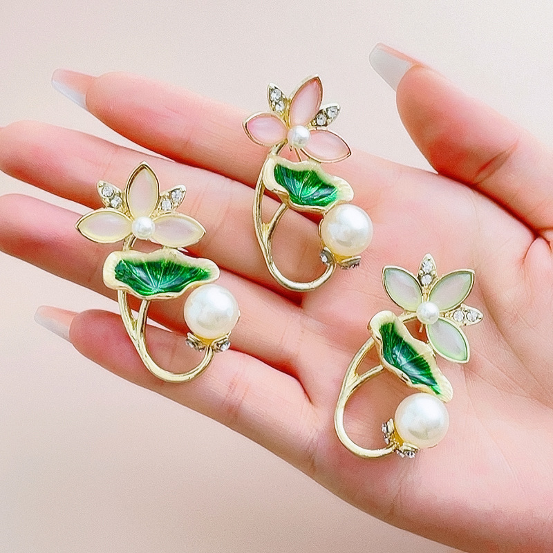 合金の精巧な緑色のハスの葉のハスの花のブローチは真珠の気質の胸の花の女性の板材の滴の油のピンのブローチをつけて卸売りします。