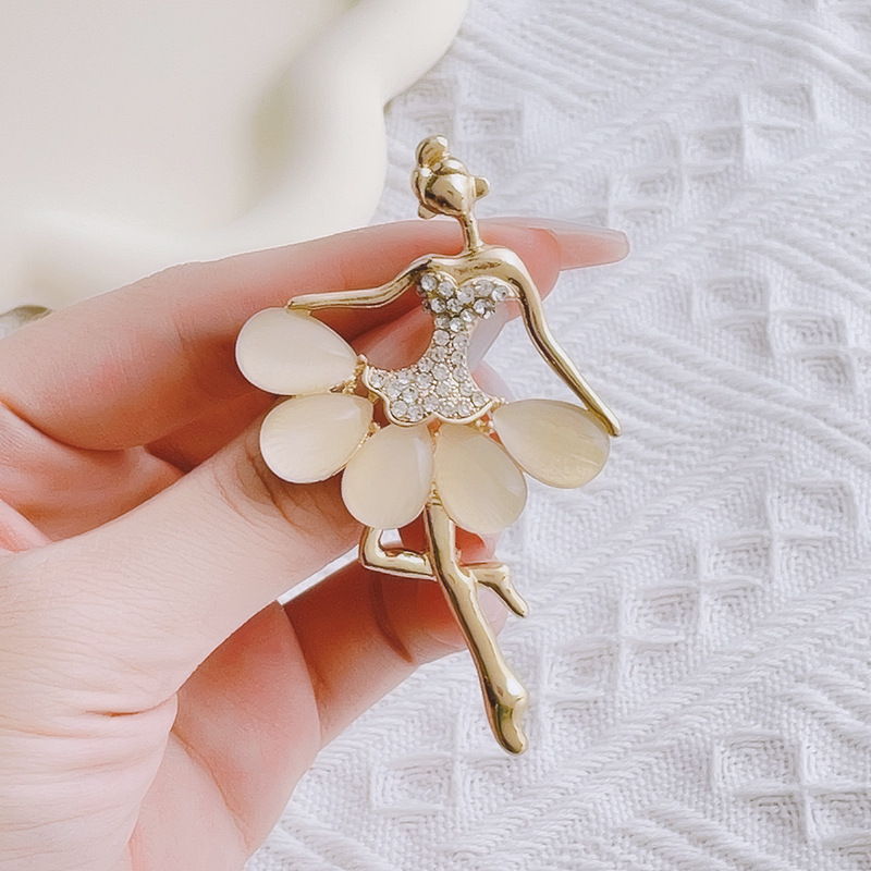 欧米の国境を越えた雰囲気のバレエ女性の猫の目のブローチのアイデアはダイヤモンドの胸の花のピンのファッションの気質の服装の装飾を入れます。