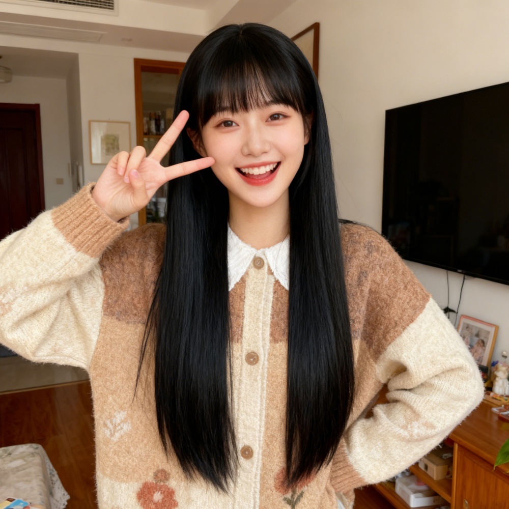 短いストレート梨の花の頭の空気の前髪は自然にリアルに顔を修理します。