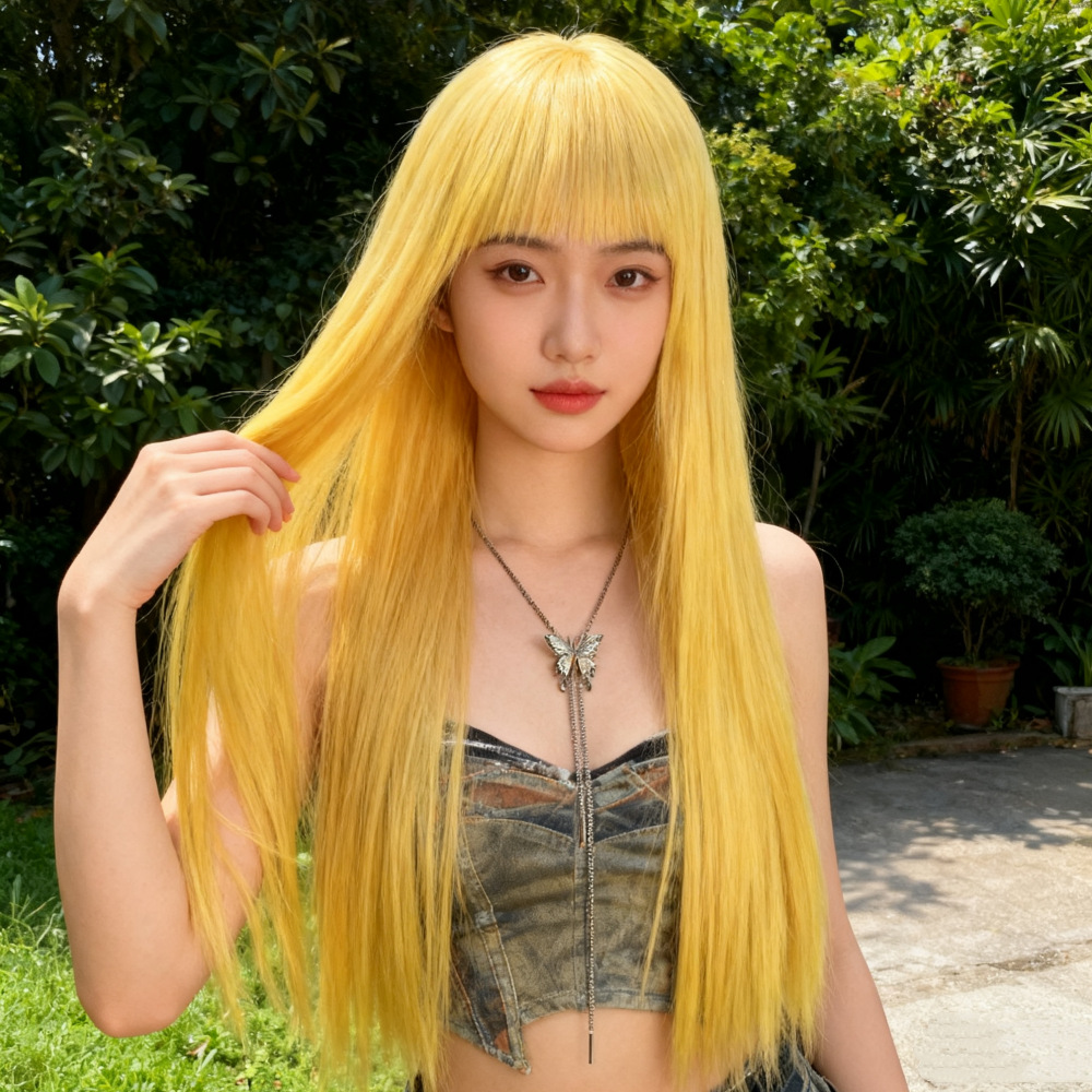 外国貿易のかつらの女性の空気の前髪のレモンの黄色の長さはまっすぐに高温の糸の化繊の頭のカバーの現物の代行のメーカーを出します。