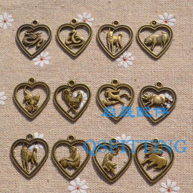 Diyアクセサリーアクセサリービーズ素材24mm古青銅ハート形十二生肖レトロ合金携帯ストラップ