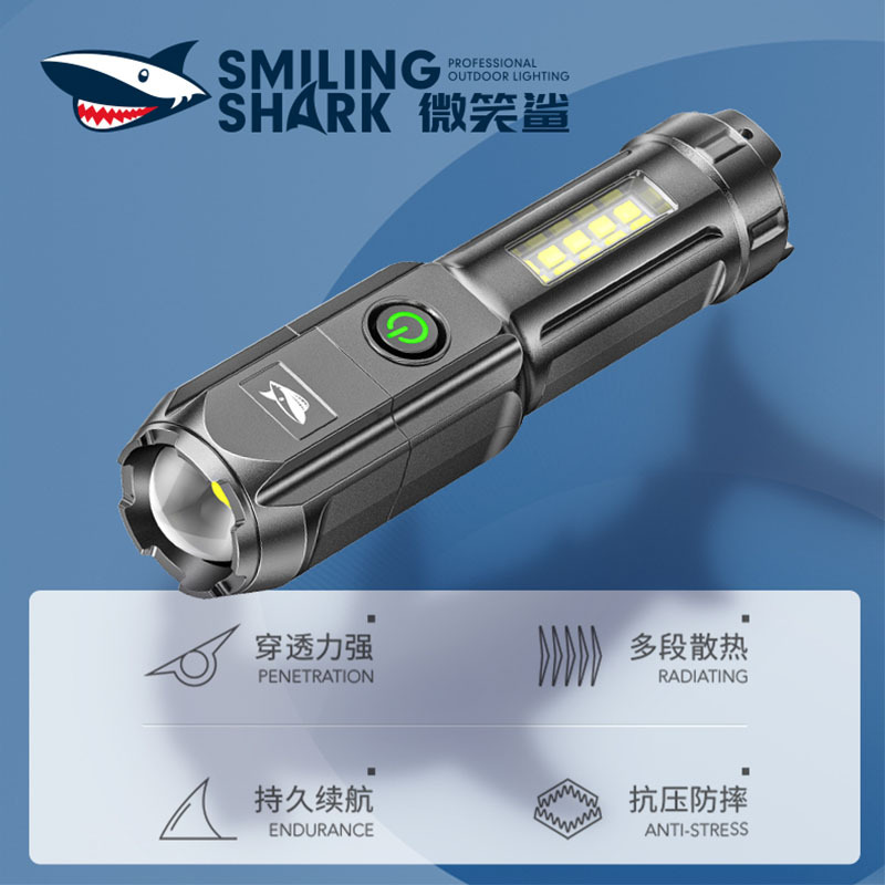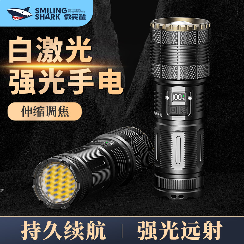 スマイルシャークハイライト長距離ポータブル懐中電灯ホワイトレーザー屋外ハイキングキャンプライトマルチスピード調整懐中電灯