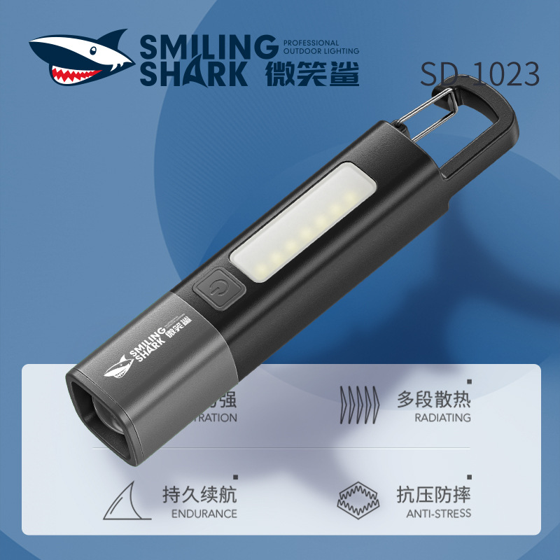 微笑みサメ伸縮ズームミニ屋外キャンプ懐中電灯COB投光サイドライトロックデザイン携帯型懐中電灯