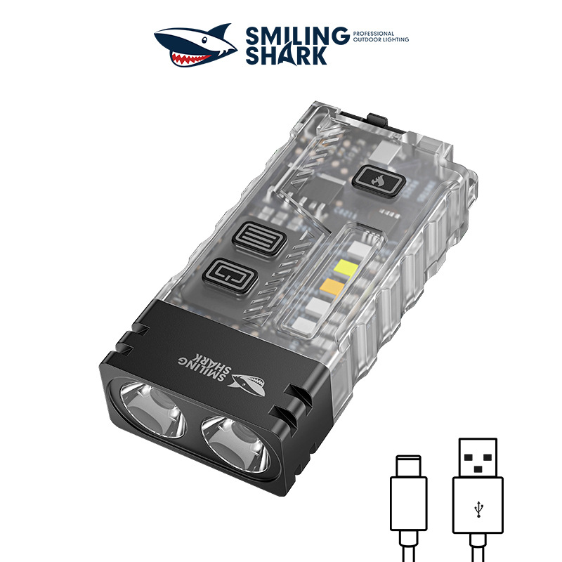 にこにこしたサメの強い光がハイライトされた充電ミニ懐中電灯の屋外で緊急アルミ合金の懐中電灯を持ち歩く