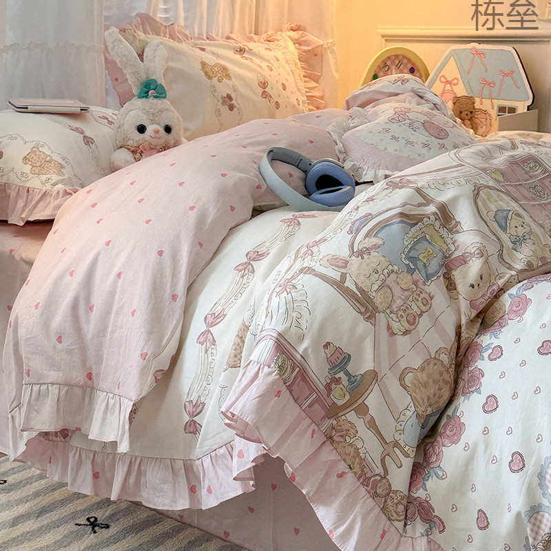 Suxuan 純綿エッジロリータプリンセススタイルベッド 4 点セット綿ガールピンクシーツ寮キルトカバー寝具