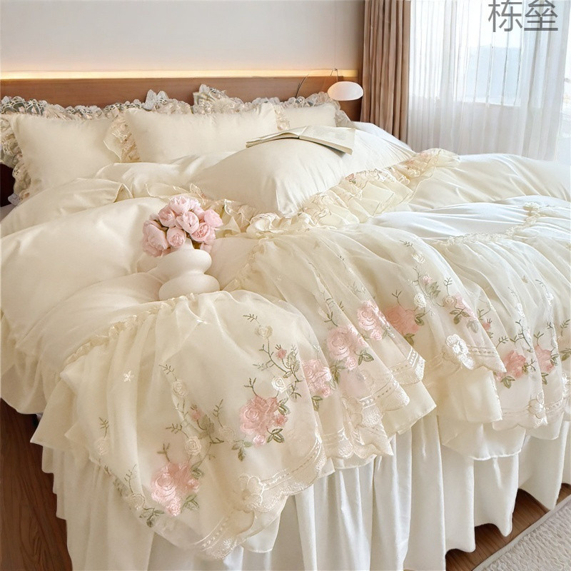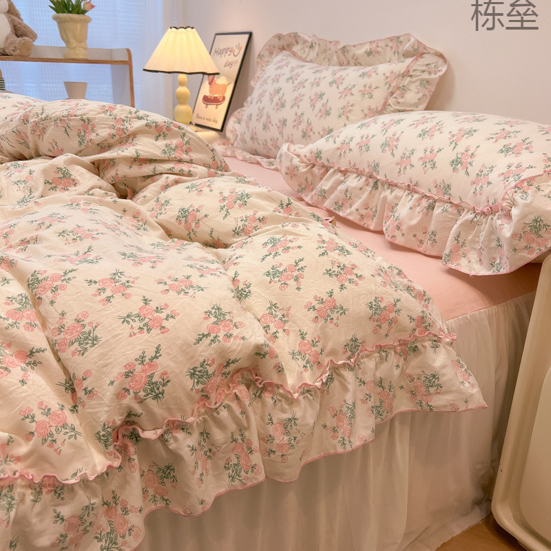 【店頭売れ筋】韓国風レースウォッシュコットンベッドスカート4点セット、掛け布団カバー、シーツ、ボックスシーツ、オールシーズン対応