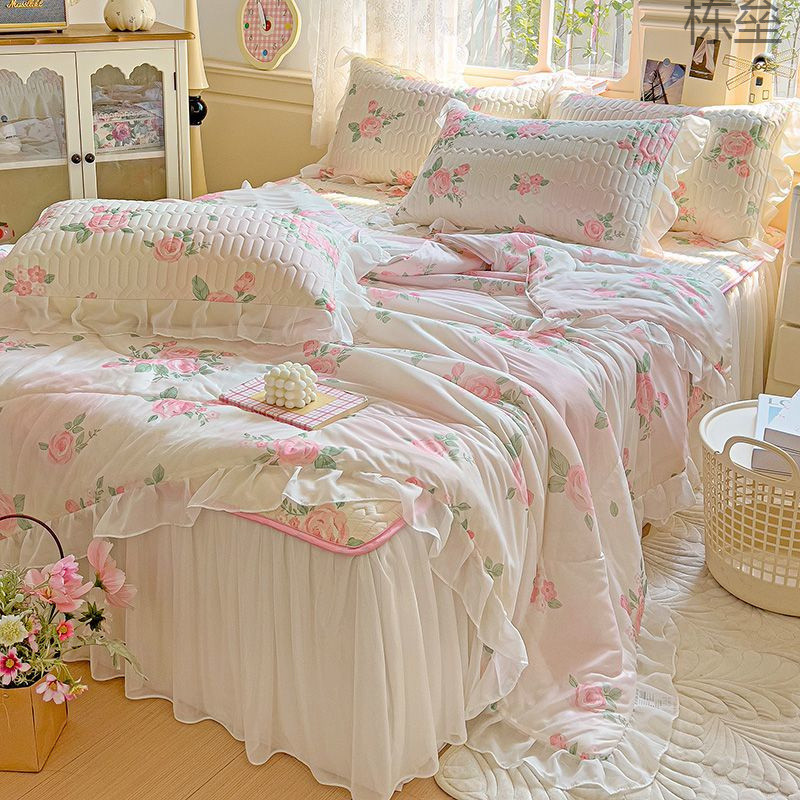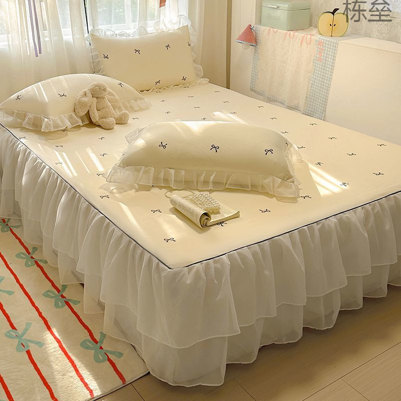 【店頭売れ筋】プリンセス風二層シフォンベッドスカートスタイルアイスシルクマットエアコンソフトマット3点セット