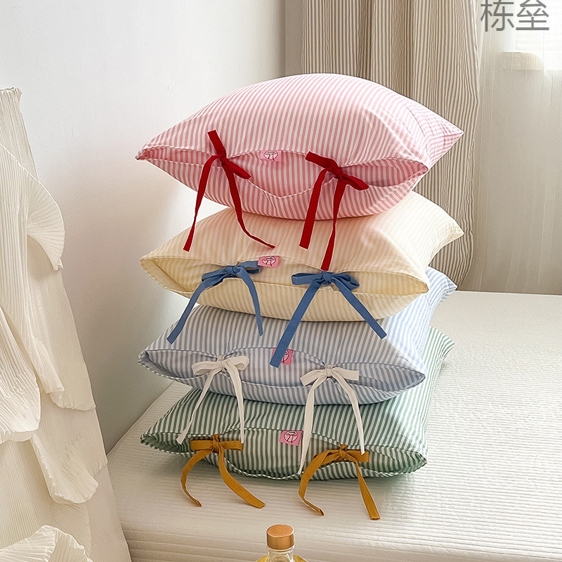 Xianmei コントラストカラーレースアップリボン純綿枕カバーインストライプ綿枕カバー 48*74 センチメートル枕カバーのペア