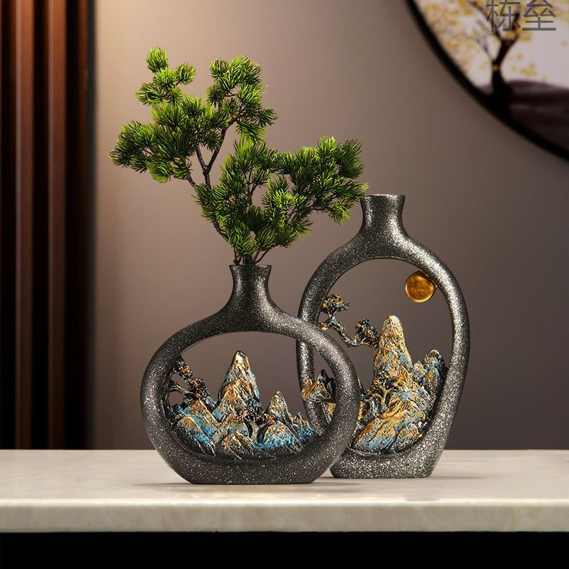 新しい中国風の鹿レトロな山の風景花瓶禅装飾花瓶玄関リビングルーム模擬花松装飾