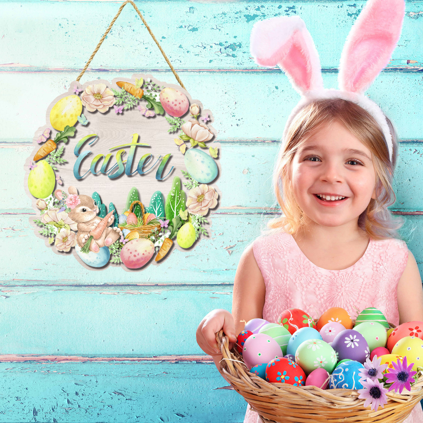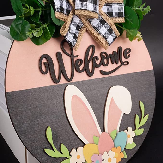 イースター木製看板ウサギ歓迎ドア掛け棚田舎イースター木製花輪マーク