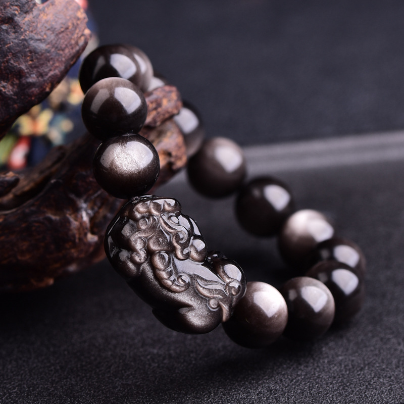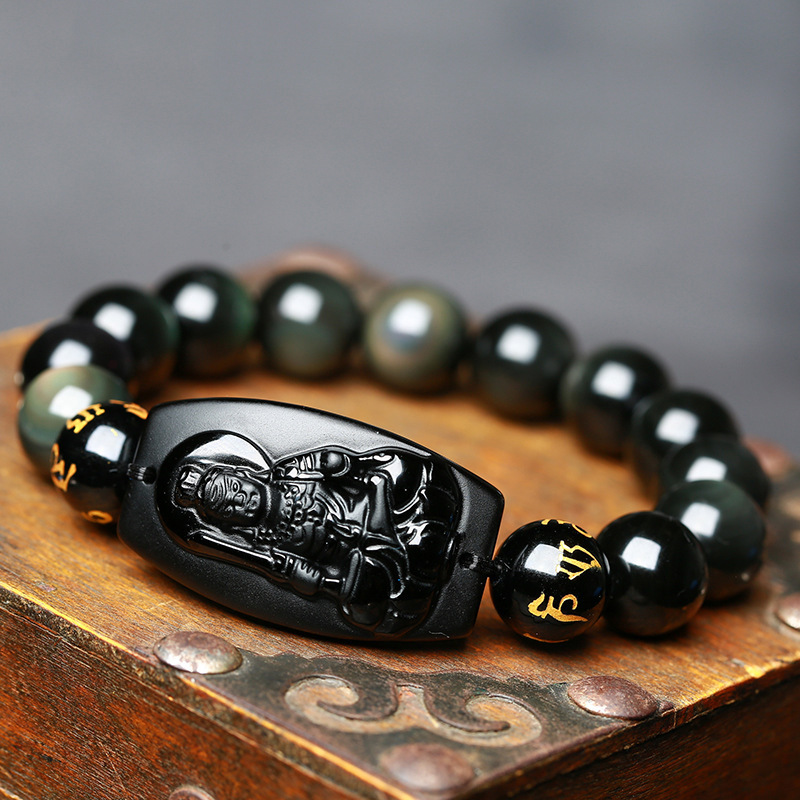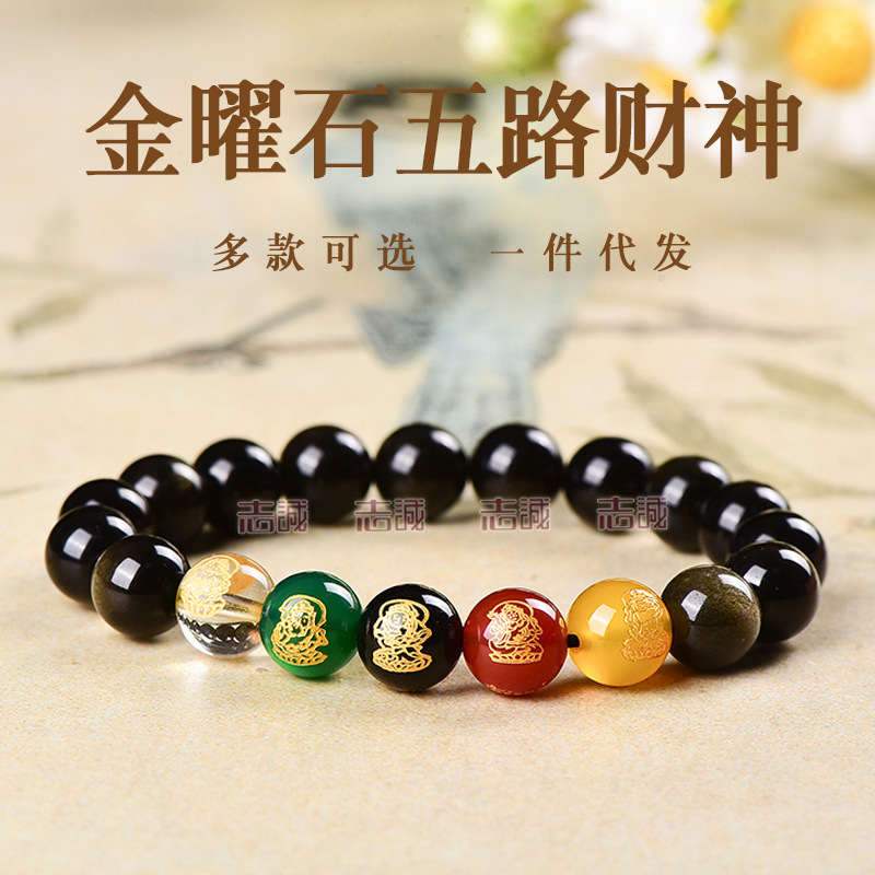 天然金曜石五路財神男女金ブレスレット虹眼黒曜石赤黄白緑黒烏金手串