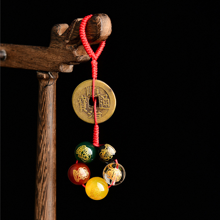 天然メノウ五路財神赤コーヒー色紐キーホルダー黄銅五帝銭携帯チェーンバッグ12mm
