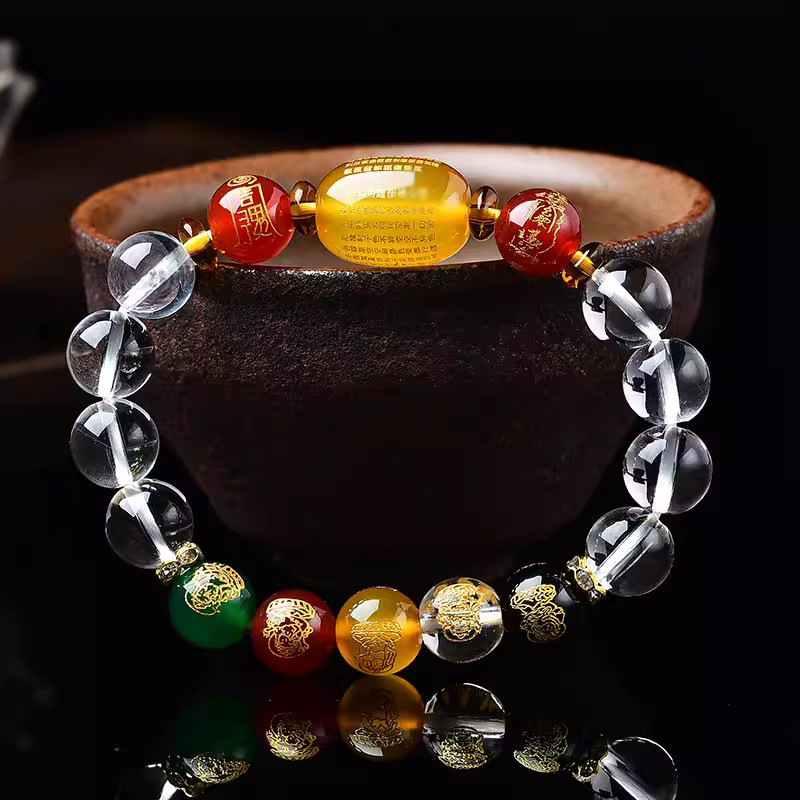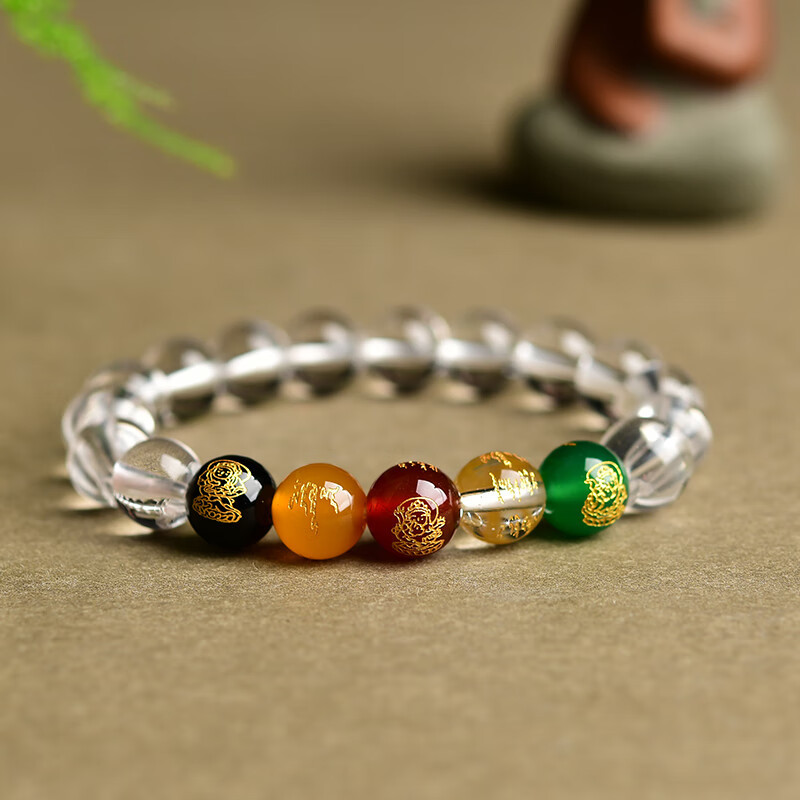天然白水晶五路財神男女金ブレスレット赤黄白緑黒五行手串福禄寿喜財卸売り